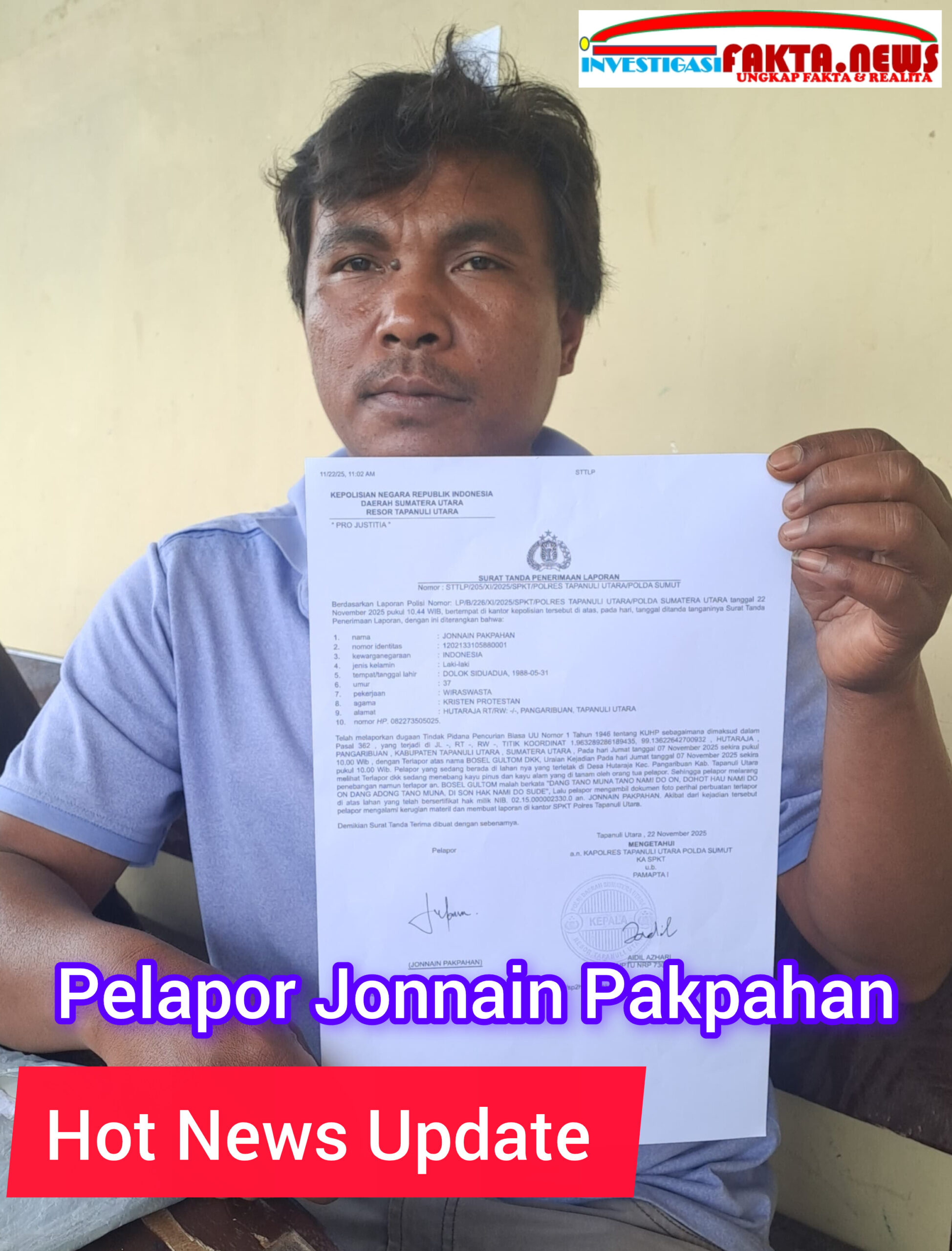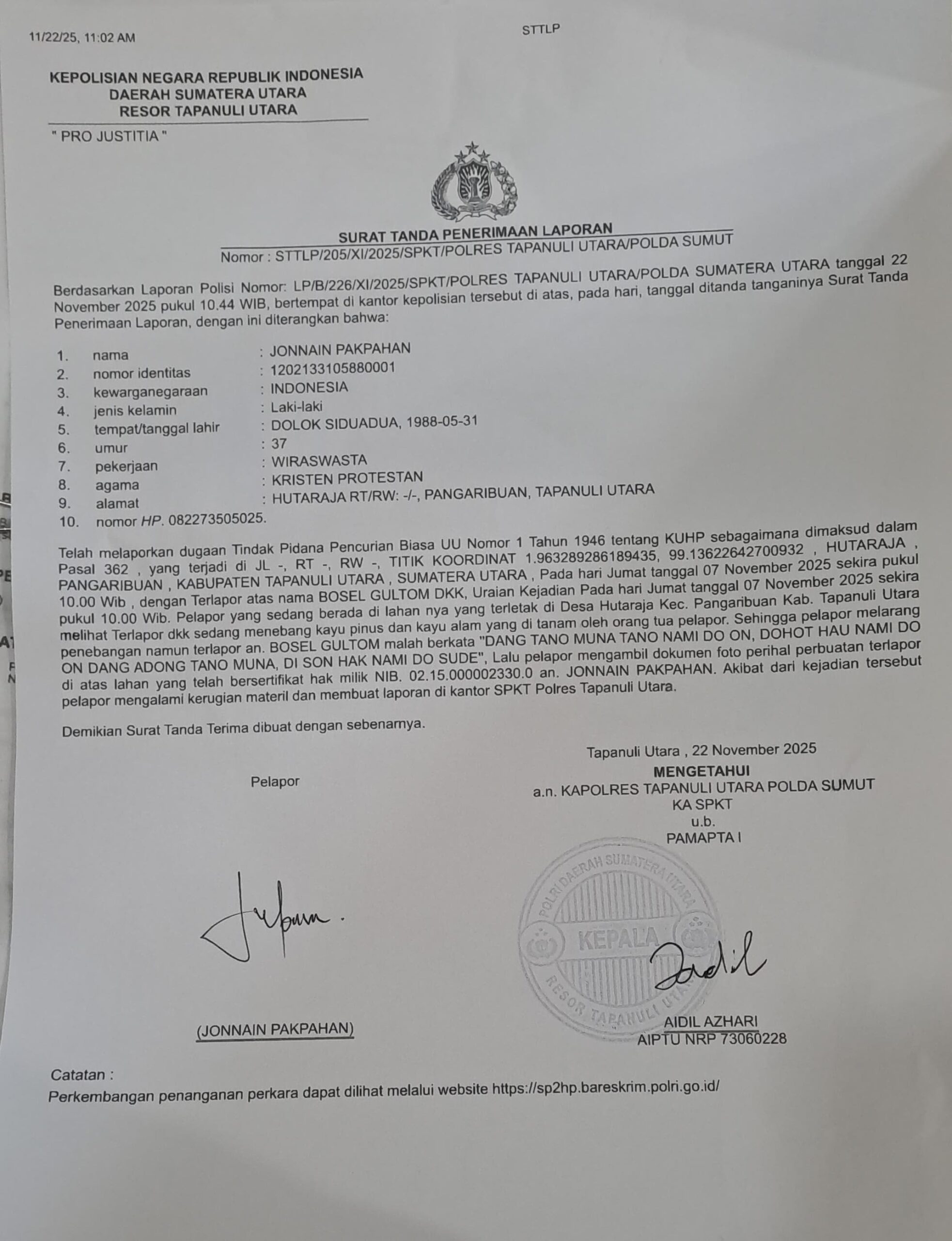 INVESTIGASIFAKTA.NEWS||Pemilik tanah, Jonnain Pakpahan, resmi melaporkan dugaan tindak pidana pencurian kayu alam, Pinus (tusam) kayu anti api yang terjadi di atas lahan miliknya seluas ± 1 hektare yang terletak di Desa Hutaraja, Kecamatan Pangaribuan, Tapanuli Utara. Laporan tersebut teregister dalam STTLP/205/XI/2025/SPKT/POLRES TAPANULI UTARA/POLDA SUMUT pada 22 November 2025.